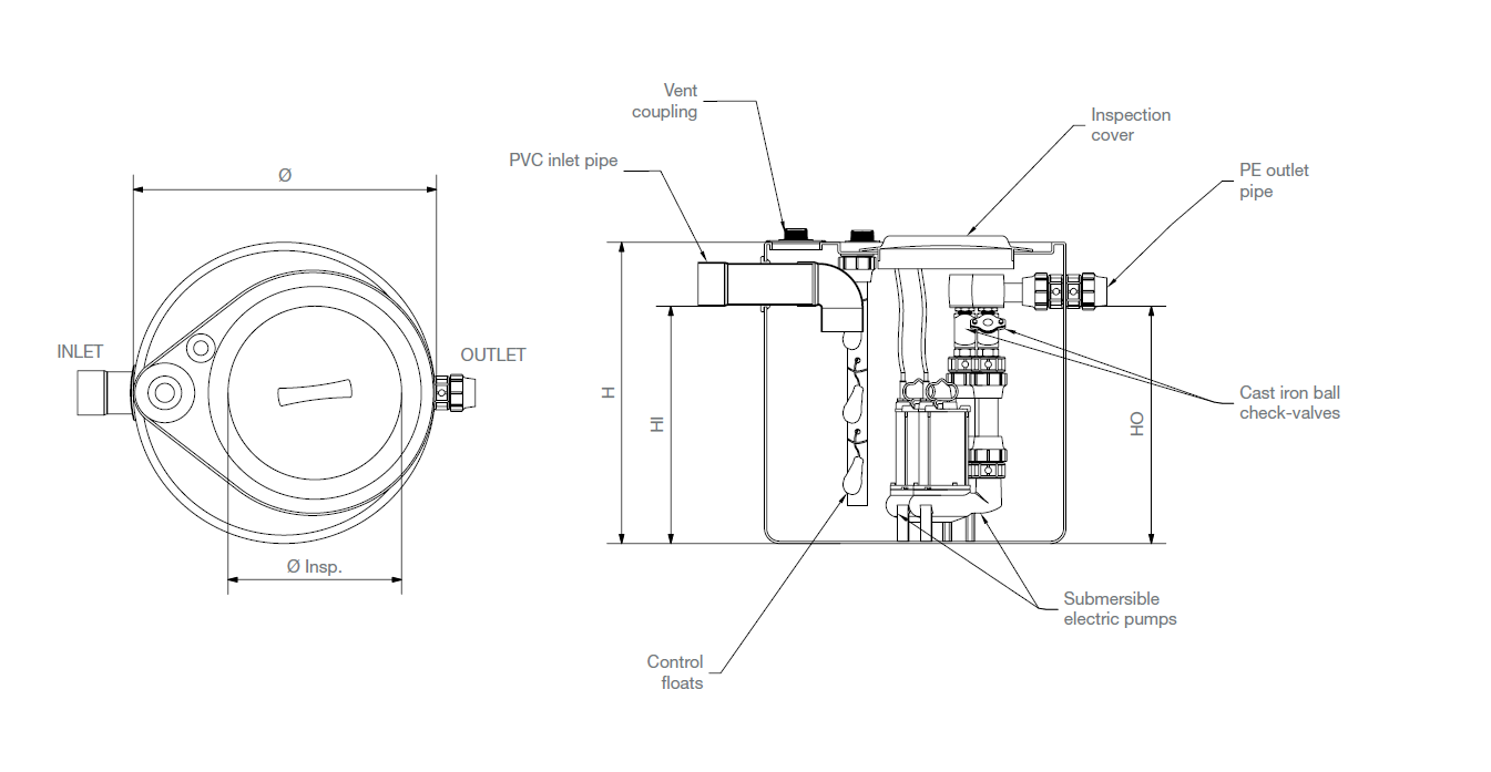 The station consists of a linear polyethylene (LLDPE) storage tank of various sizes, with a submerged electric pump installed inside it. If the flow rates of waste water to be lifted are very high and/or variable and if the presence of a spare pump is necessary, dual pump models are provided. The pumps are connected to suitable electric panels so that, according to requirements, the start-up command can be either manual or automatic by means of start/stop float switches located inside the tank.