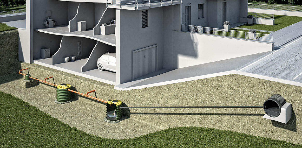 Sewage lift stations are systems that allow effluent to be lifted and transferred to stations located at higher levels (sewerage systems, treatment systems). They become necessary, for example, when the discharge level of a WC is lower than that of the treatment plant or sewerage pipes (cellars, underground premises, etc.) and when the hydraulic profile of the treatment system cannot work by gravity.